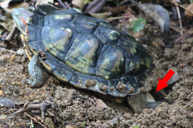 かくして、いつも見るたびに水底にジッとしているか、せいぜい鼻先だけ水面に出している程度が続いていたんですけど、今日遂にバスキング姿を見ることが出来ました!