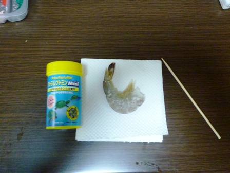 まずは今現在かろうじて食べてくれるエビ(生・冷凍)と、全くもって無視されっぱなしのレプトミンminiを準備